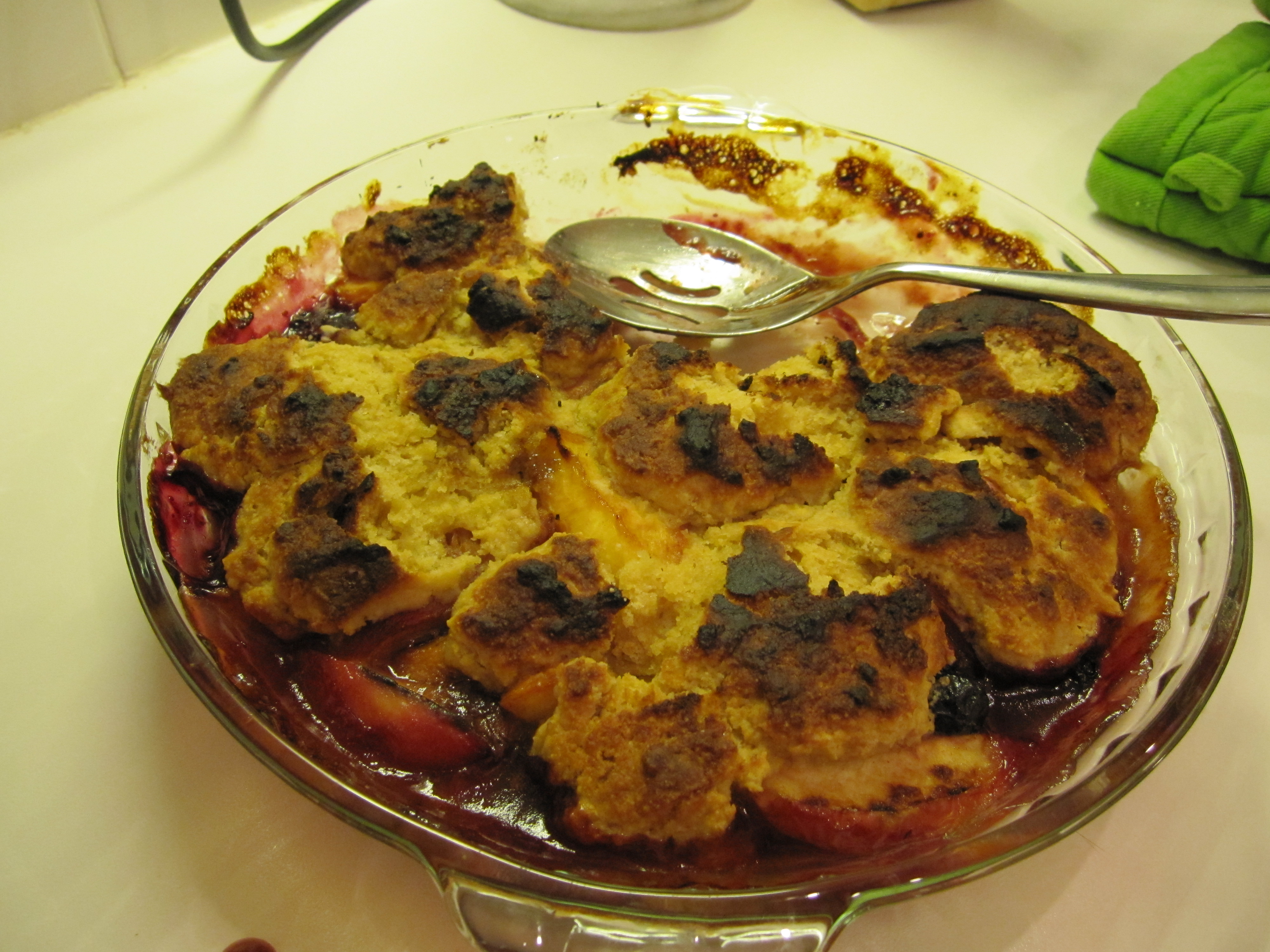 This is what happens when you mistakenly set your stupid pictogram oven to Lightning Steaks and leave your gorgeous peach-blueberry cobbler in there for a few minutes before realizing your grave error.