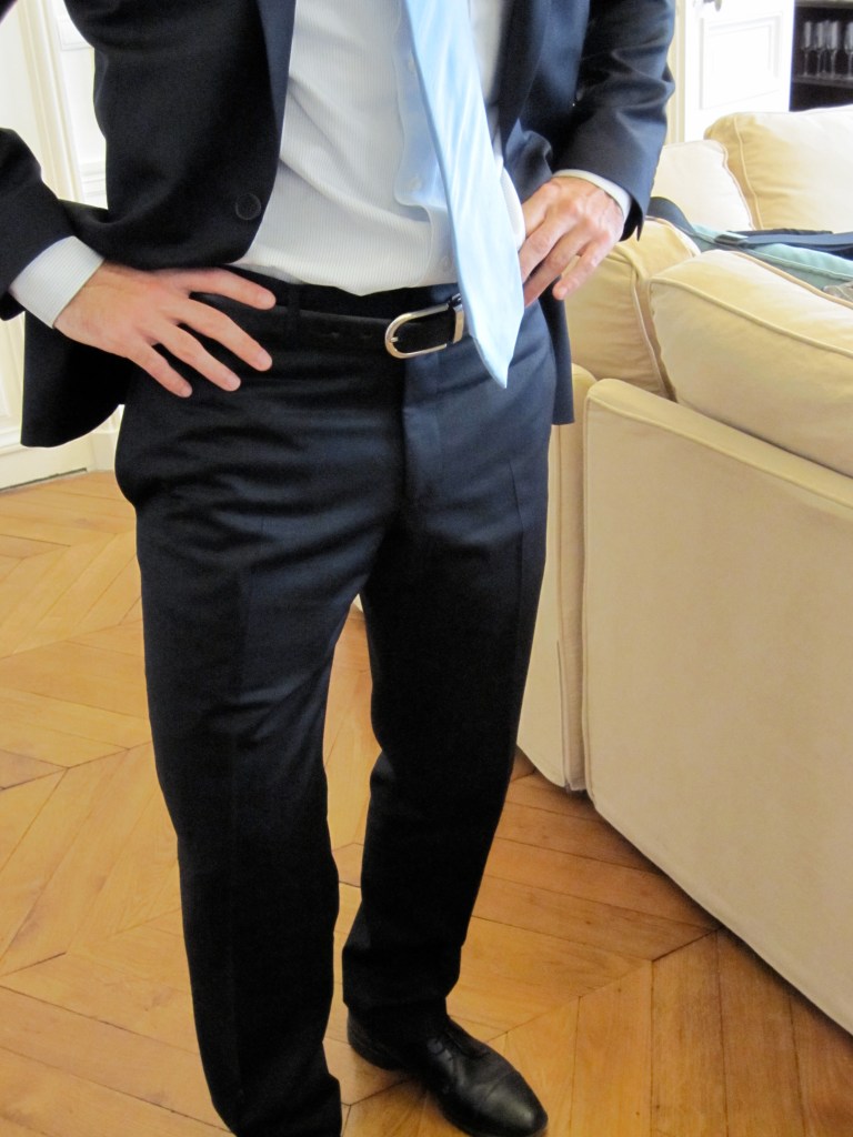 For those of you unaware of the vast differences between French and American tailoring, let’s just say that the cut here doesn’t leave much to the imagination. It’s skinny. It’s tight. The pants manage to make Husband (a skinny man) look like the Incredible French Hulk. Or as he explained it, “If I fart, my entire pant leg vibrates.”
