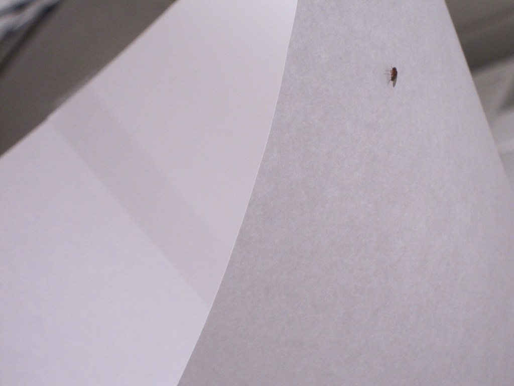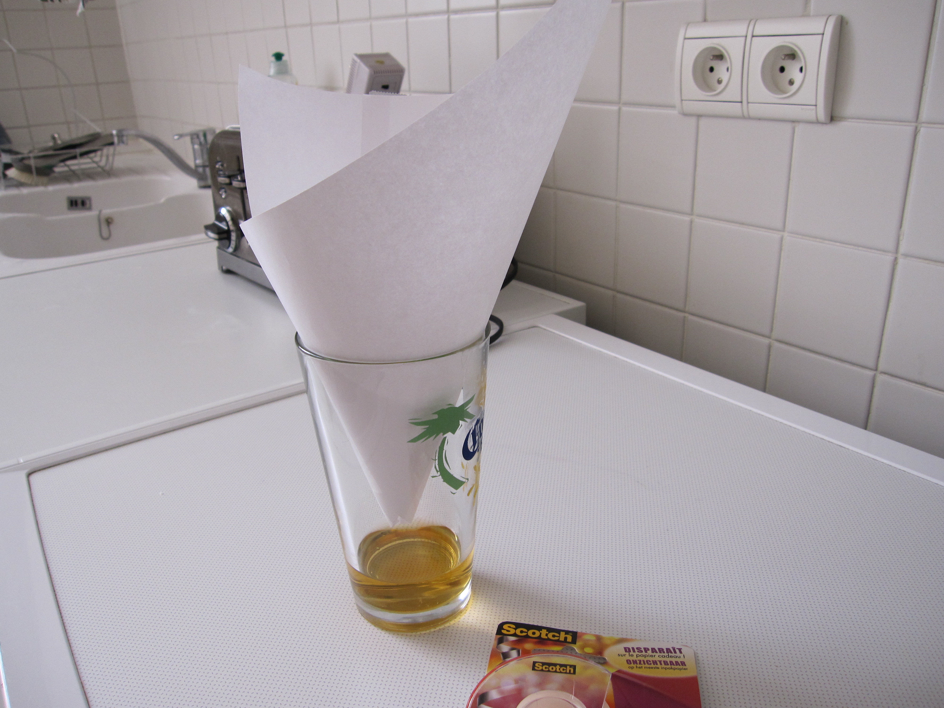 I’m fairly certain it’s not fleas, since I can see the fruit flies and mosquitoes circling and last time I checked, Husband’s body hair had not yet reached canine levels. So yesterday I decided to get all crafty up in this piece. My bug death trap is sinister yet simple in construction: pour a little vinegar into the bottom of a glass. Roll a piece of paper into a cone, taping it in place. You want a small opening that hovers just above the vinegar. That way the flies, unable to resist the siren call of fruity fermentation, fly down your paper cone of death and either splash to their vinegary end or panic when they can’t find a way back out.