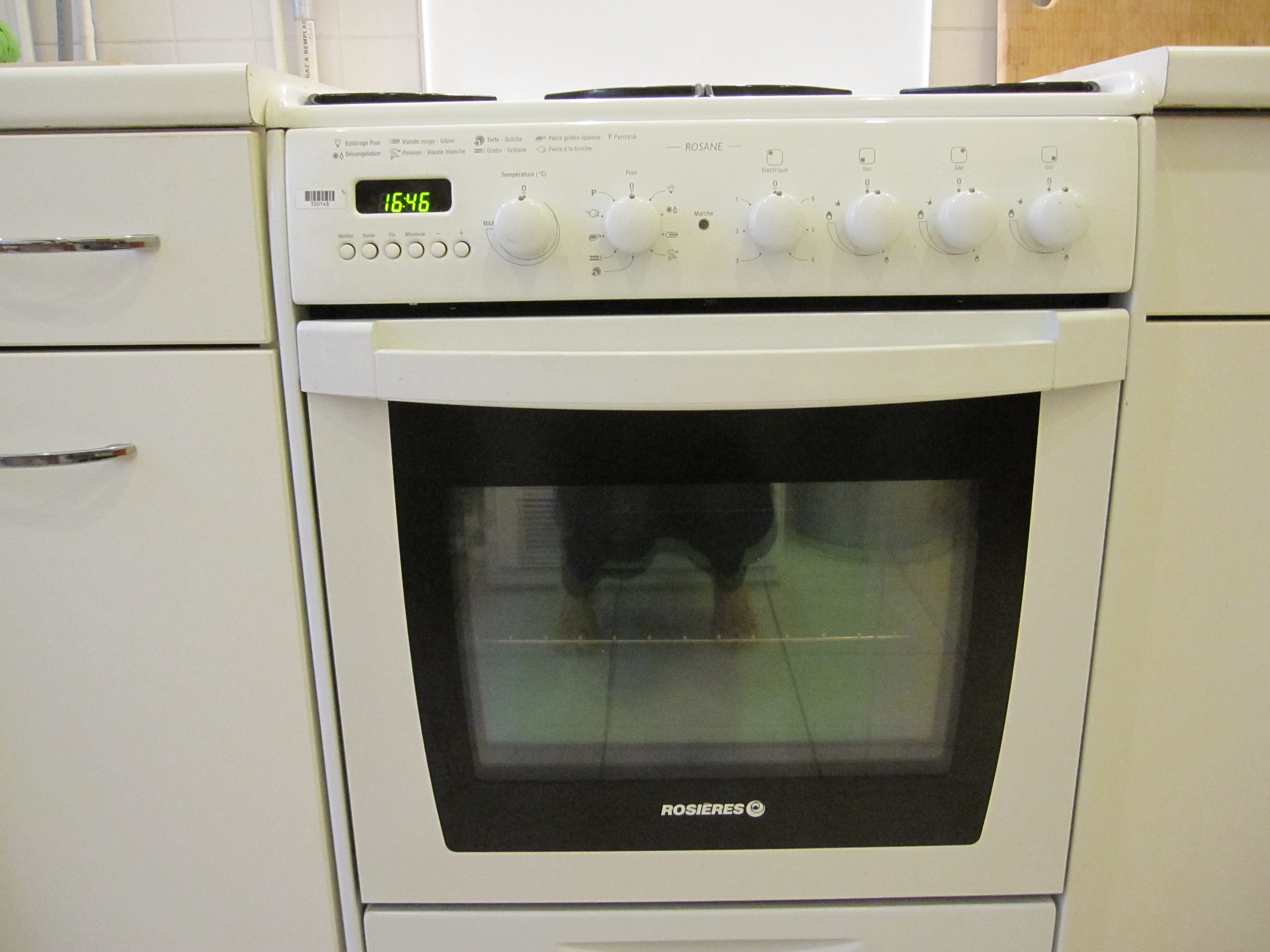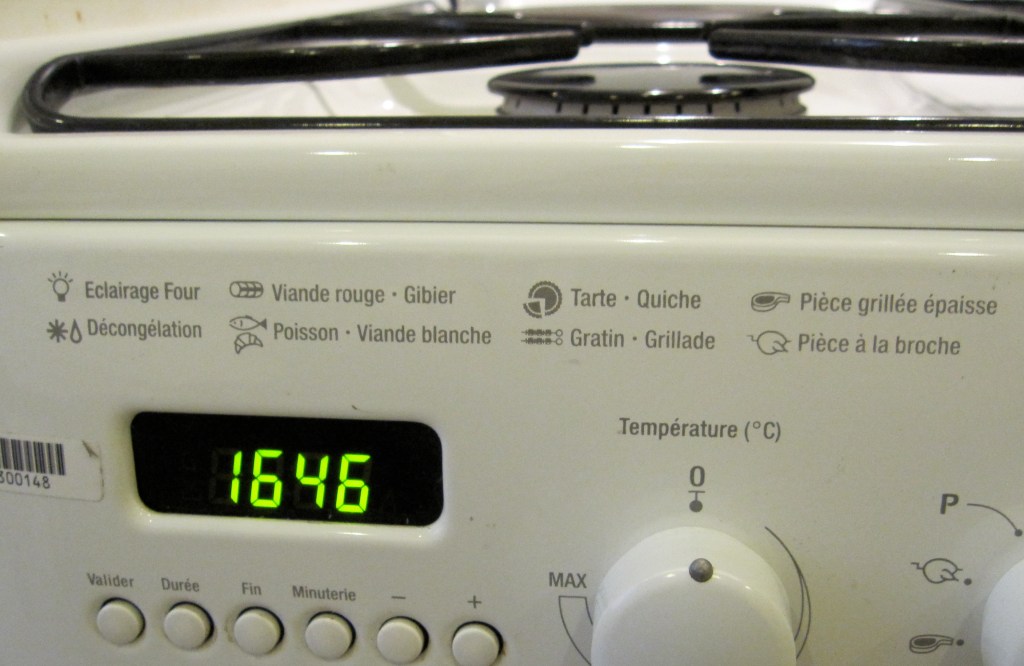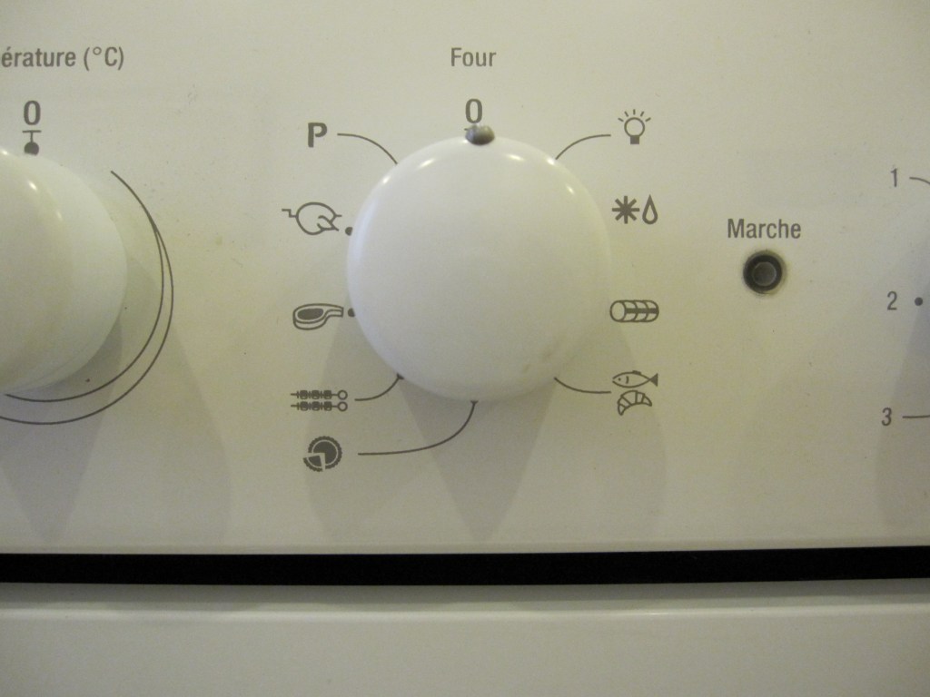 Anyway, she was wheeled in this afternoon, as the old pièce de merde was unceremoniously wheeled out (sans sledgehammering). After she was hooked up, the repair men called me in to check it out. And because I’m living in Paris, with open access to pastries and champagne, the gods decided to even things out a bit by again making sure that my oven has pictograms where most logical people would just put a bake/broil/self clean dial: