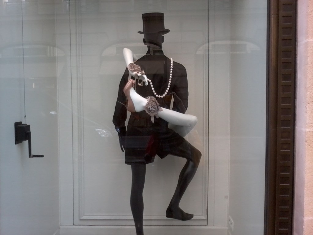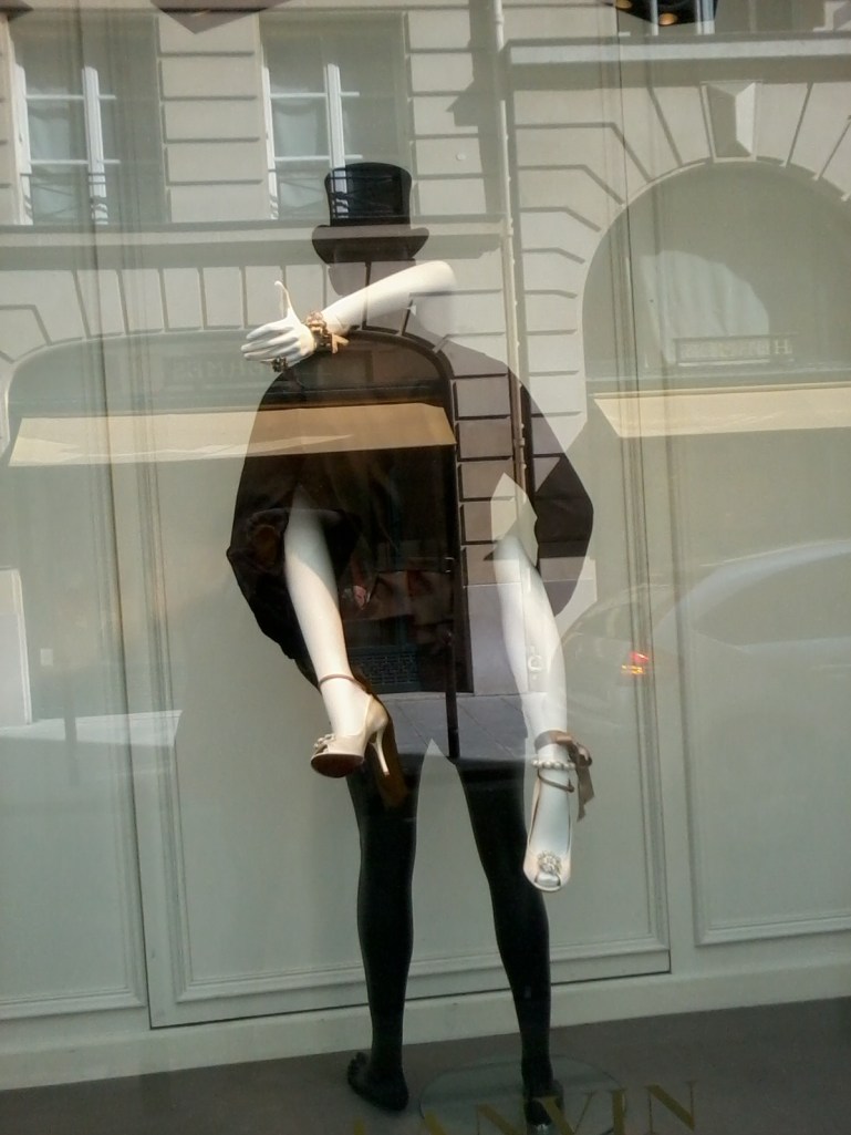 The fancy French fashion house Lanvin always has the best window displays at the store on Rue Saint-Honoré. So I had to stop and marvel at their latest offering, featuring several mannequin couples caught up in racy embraces. At first glance I thought, awww, they’re kissing! And then I saw this one: