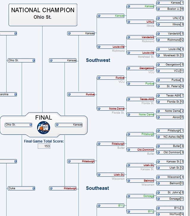 We said the seeding and rank could help you pick, but when it really came down to it, one just had to devine the outcome. And devine she did: Our 60 year old French teacher, who’s probably never watched a day of college basketball in her life, is currently 34 for 44 and rocking first place. Bien sur.