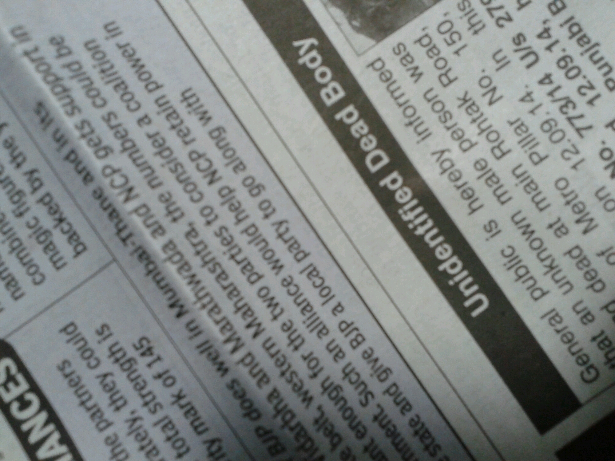 No words. September 23, 2014India, Local Flavor Flipping through The Times of India and found this ad from the local police. It’s asking for information and includes a photo(!) of a dead person. I guess that’s one way to solve the case… weird classifiedsShare the funny: Click to share on Facebook (Opens in new window) Facebook Click to share on X (Opens in new window) X Click to print (Opens in new window) Print Click to email a link to a friend (Opens in new window) Email Click to share on Reddit (Opens in new window) Reddit Click to share on Pinterest (Opens in new window) Pinterest Click to share on Tumblr (Opens in new window) Tumblr Like Loading... Related